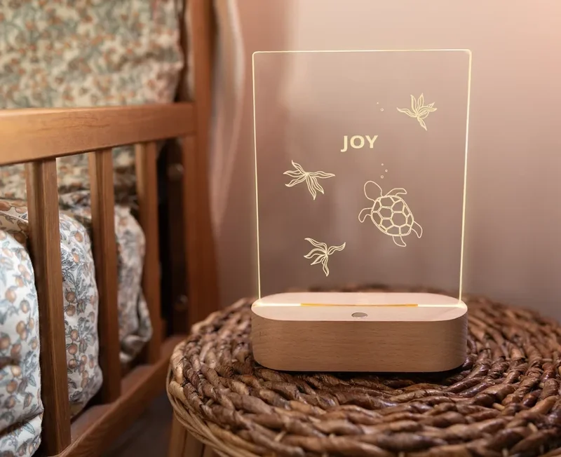 Niets is leuker dan een cadeau waar moeite voor is gedaan en helemaal als er een persoonlijke touche in zit. Zo vind ik het super leuk om een knisperdoekje te laten maken van het geboortekaartje en heb ik recept nog een prachtig glazen nachtlampje gekocht met een naam en geboortedatum erin (zie afbeelding). Maar ook zelf heb ik een droogbloemenkrans gehad met naam en bordjes met de losse letters van hun naam. Ik vind dit blijvend leuk!