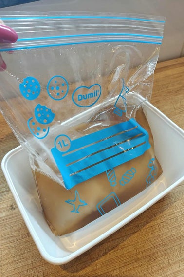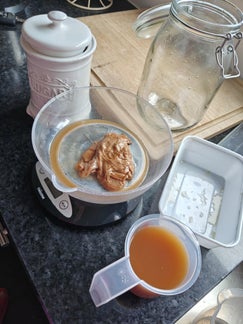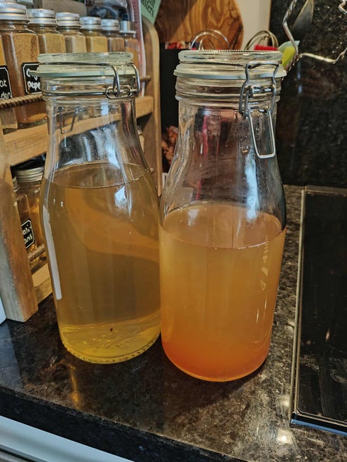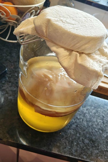Gebruik (een deel van) de zwam en wat kombucha als starter voor een nieuwe lading (50 ml).
