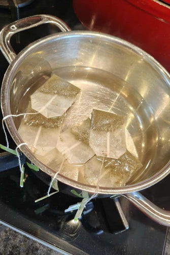 Laat hierin 3 a 4 theezakjes (of losse thee) 15 minuten trekken. Ik kies vaak voor een groene thee of zwarte thee.