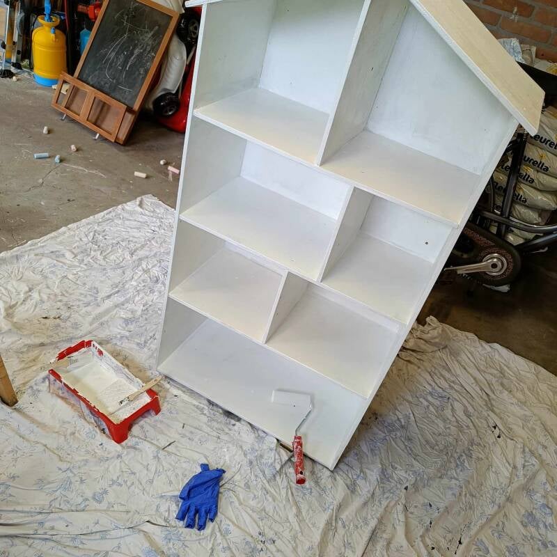 Je hebt echt geen dure materialen nodig. Een oude kast, een houten kist, een schoenendoos of zelfs een wijnkist kan de basis vormen voor een nieuw poppenhuis. Voeg restjes behang, stof, verf en karton toe en je bent al een heel eind op weg. Ik heb eerst een poppenhuis gekocht dat uit twee verdiepingen bestond (bij de kringloop) alleen toen ik vervolgens een soort kast met 4 verdiepingen tegen (ook bij de kringloop) kwam leek me dit toch iets handiger en meer honkjes/kamertjes om te vullen! De eerste heb ik vervolgens wéér doorverkocht via Vinted en met de tweede ben ik daadwerkelijk aan de slag gegaan. Voor het eerste poppenhuis betaalde ik maar liefs €25,00 euro (nu denk ik: veel te veel, maar ik liet me meeslepen in de enthousiasme van andere en verkocht hem gelukkig ook weer voor hetzelfde bedrag) voor de tweede betaald ik maar iets van €7,50