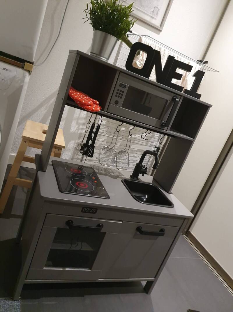 - Het oorspronkelijke plan was om het 'aanrechtblad' te beplakken met plakfolie met een marmerlook maar we vonden het grijze zo mooi dat we dit uiteindelijk niet gebruikt hebben. Verder zie je veel voorbij komen dan men er nog een achterplaat achter de keuken maakt (nu kijk je er doorheen). Daar plakken ze dan met plakfolie een stenenmotiefje of behangetje op, ook leuk maar wij vonden dat bij onze keuken niet nodig. Wij hebben de achterkant dus open gelaten. Aangezien hij naast de bank staat kan ik de kleine dan ook over de bankleuning zien spelen.