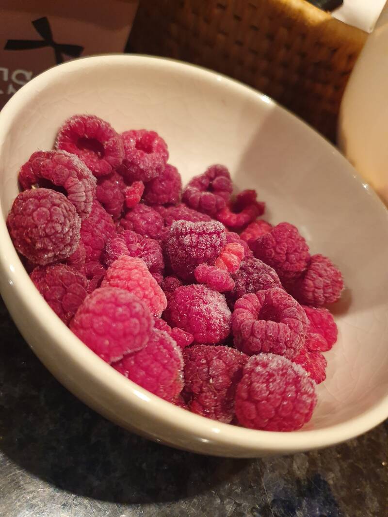 - Spatel als laatste de witte chocolade en frambozen door het beslag