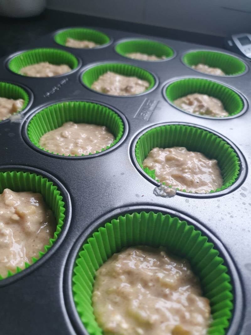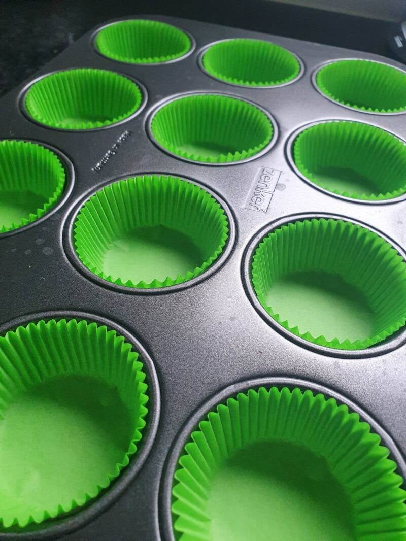 Stap 5. Vervolgens doe je de muffin houders in de vormpjes en vul je deze met het beslag, ikzelf doe net iets meer dan de helft omdat ze ook nog een eindje naar boven komen en best machtig zijn.