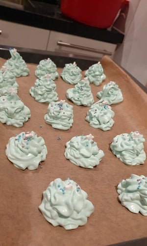 Stap 7. Je kan het mengsel nu in een spuitzak doen maar je kan ook twee lepels gebruiken om vormpjes te maken op het bakpapier van het Meringue mengsel.