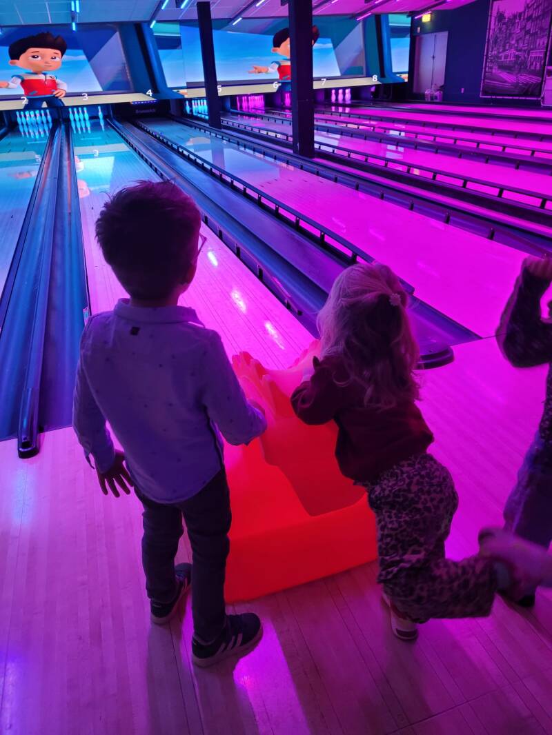 Na de taart en cadeautjes stapten we met alle kinderen in de auto en reden we richting Tiel. Gelukkig mochten ze daar hun eigen schoenen aanhouden, en we konden meteen beginnen. De namen werden door de bowlingbaan ingevoerd en… gooien maar!