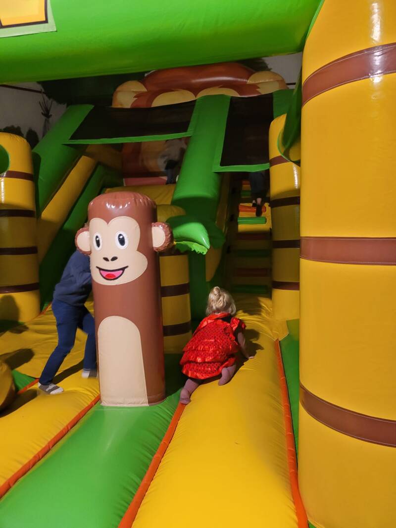 Natuurlijk werden de zijkanten omhoog gezet, en de kinderen konden gebruikmaken van een soort dino-glijbaan om de bal overheen te laten rollen. Twee lichtere ballen erbij en gáán met die banaan!