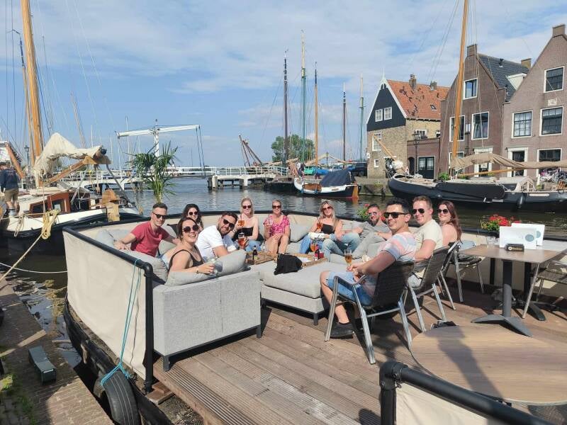 Na de foto kregen we een lekkere lunch in een café, lekker broodjes en wraps en uiteraard voldoende alcohol. Na de lunch vertrokken we op de boot naar Marken, hier ging de ene helft het terras op en de dames maakte nog een rondje door het dorp (een rondleiding op papier), best leuk om even doorheen te lopen. Ik moest echt enorm denken aan Giethoorn, die vibes kreeg ik daar. Vervolgens op de boot terug naar Volendam waar we doorliepen naar de verhuur van e-chopper, drie uur lang mochten we tekeer gaan. Het was even wennen maar daarna echt leuk over de dijk heen naar Monnickendam. Daar belandde we op een boot in de haven die omgebouwd was naar een terras. Het weer zat ook echt enorm mee, dus we hebben daar echt lekker kunnen vertoeven, na een tijdje vetrokken we weer terug op de E-choppers terug naar Volendam.